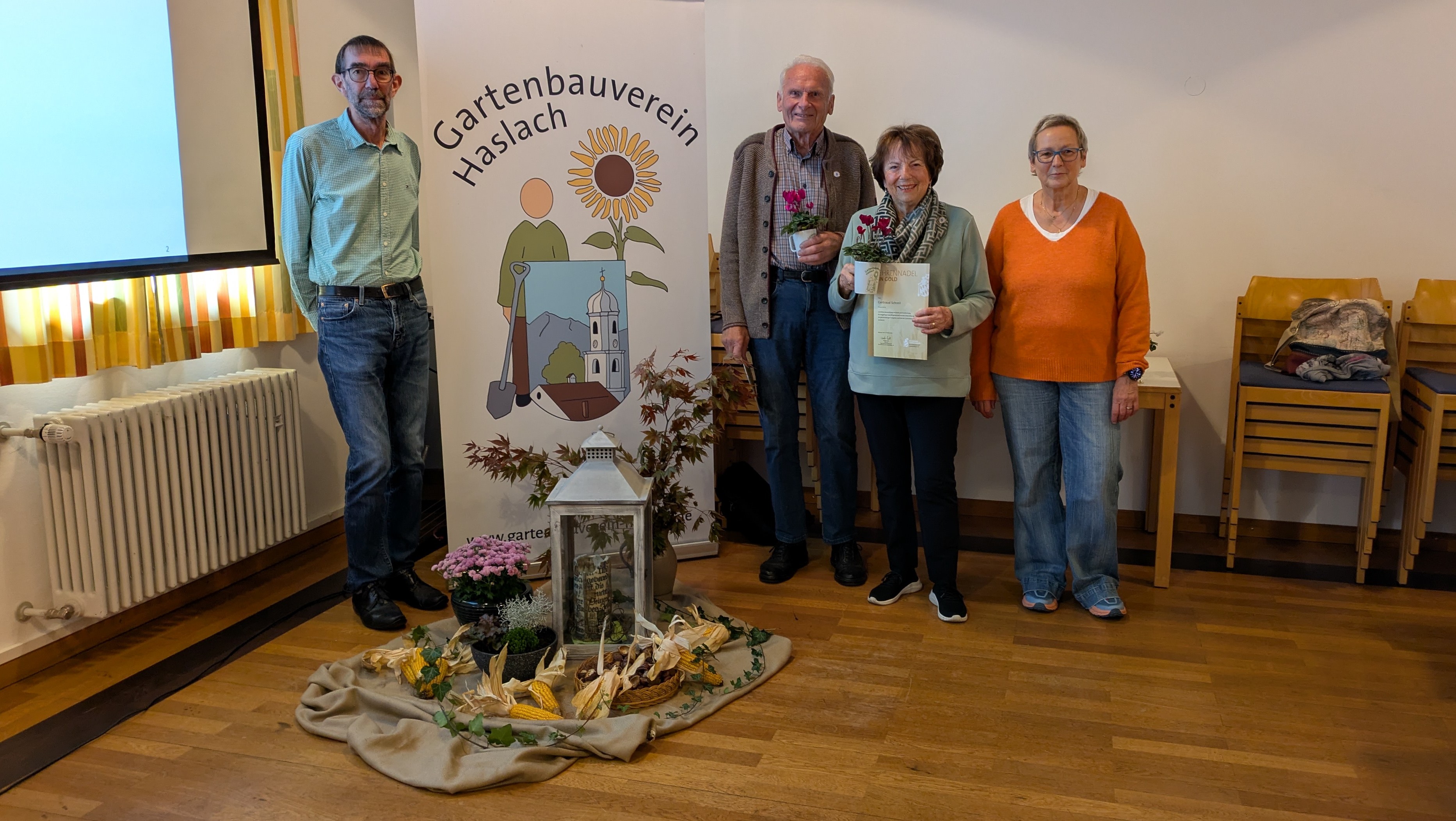 Im Rahmen des Herbstkaffees des Gartenbauvereins Haslach wurden vier Mitglieder für 40-jährige Treue zum Verein geehrt: Gertraud Schreil und Franz Hasenöhrl waren anwesend, Silvia Biskup und Theo Mähler waren entschuldigt. Die langjährigen Mitglieder wurden mit der goldenen Ehrennadel des Landesverbands und einer Urkunde ausgezeichnet, ebenso erhielten sie ein kleines Dankeschön des Vereins.